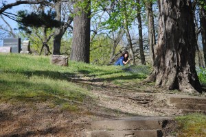 In Georgia, I walk flat land, through fields, around ponds, and along the banks of rivers. I climb through barbed wire fences and head deep into the woods. I walk through abandoned houses, but South Georgia’s landscape is different from that of Peoria’s. Here, in this part of Illinois, the flat land of cornfields will betray you. Don’t trust it for a minute. The next thing you know the fields will be far behind you, and you’ll be climbing to magnificent views overlooking the Illinois River. You’ll be ascending ancient hills where the dead of Peoria are buried.