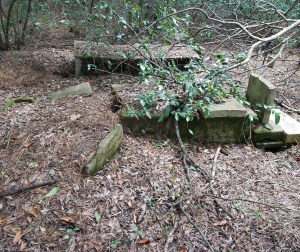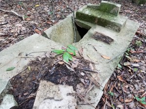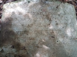 If I’d been using my brain, I would have gone prepared to rake, clear the debris, and clean headstones. But I arrived with a camera and little else. Richard had a small tool of some sort and a walking stick, but those items weren’t enough. I needed gloves for my hands and a car broom so I could sweep dirt from the slabs. I should have brought some aluminum for the headstones I couldn’t read. By placing a thin sheet of aluminum foil against the stone, or by wrapping it around the stone, and brushing the area with a clean makeup brush, it is often possible read the words left impressed in the foil. But I arrived unprepared and unorganized.