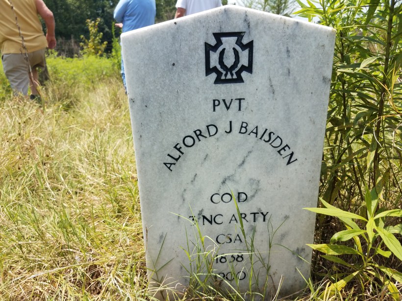 The first headstone we examined belonged to Pvt. Alford S.Baisden, 1838-1900. We discovered many slabs, headstones, and monuments in the thick of tall weeds. Because the enclosed area was filled with gofer holes, my husband told me to watch for rattlesnakes. Under the looming threat of snakes, and unable to contain my excitement, I got on my hands and knees near gofer holes, determined to uncover slabs, knowing I might stick my nose in the face of a rattlesnake.