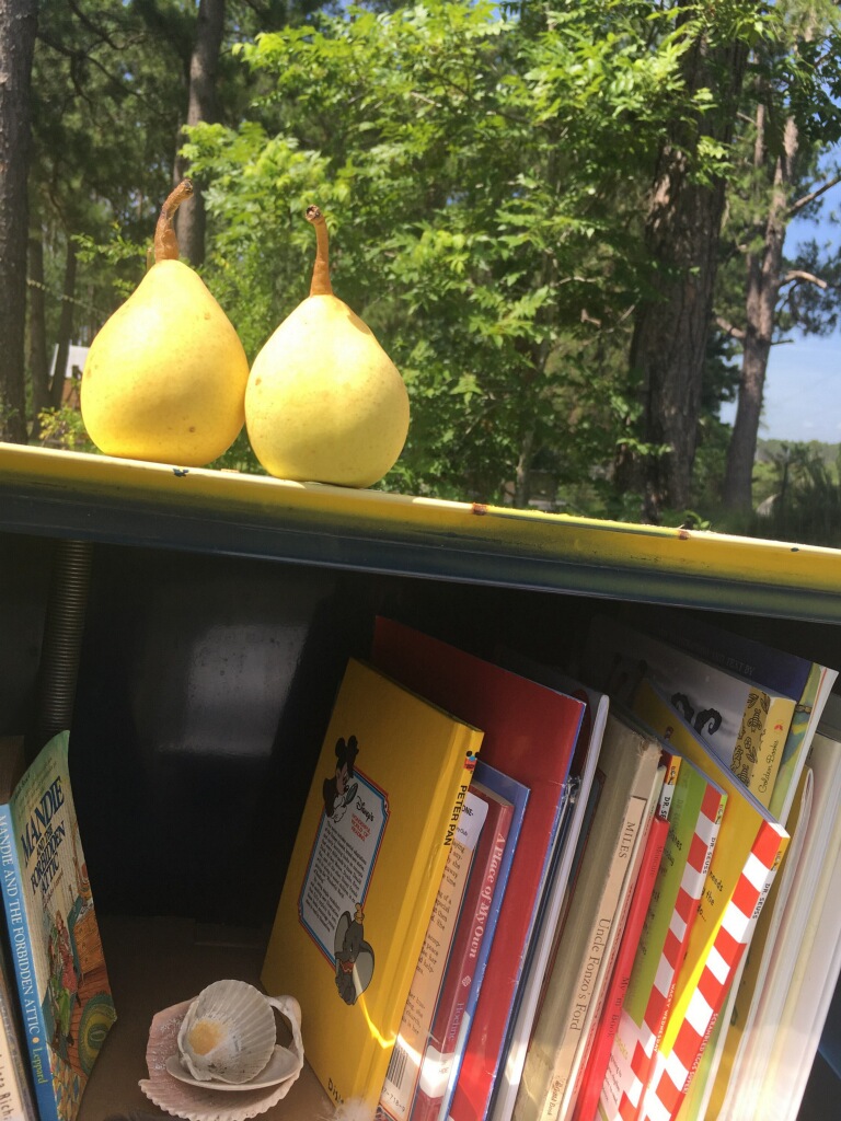 My friend Polly Huff has a free library provided by Tifton Twentieth Century Library Club. Made from a vintage newspaper kiosk, it is located in Pebblebrook and filled with children’s books. The day I spoke to her she’d placed rooster feathers, cool rocks, and shells from her farm beside the books, gifts for the children. At times, she leaves pears, fresh from her trees, on top of her library, and they are there for the taking. She told me children have already been using it, taking and leaving books and other found objects.